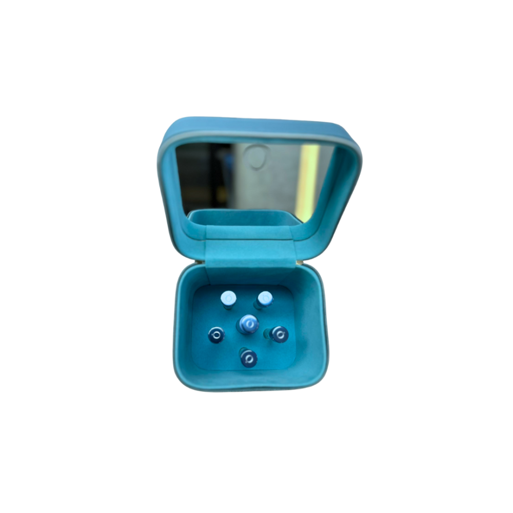 كل ذلك داخل شنطة فاخرة بلون أزرق ملكي، بملمس يجمع بين الجلد الناعم والقماش المخملي، لأن التفاصيل هي من تصنع الفرق.
